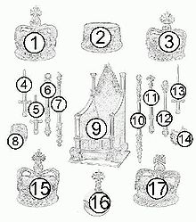 1: Imperial State Crown 2: Mary of Modena's Diadem 3: The State Crown of Mary of Modena 4: One of the four Swords borne before the monarch. 5: Sword of Mercy 6: The Sovereign's Sceptre 7: Sceptre with the Dove 8: Sovereign's Ring 9: King Edward's Chair (the Coronation chair) 10: 11: En:The Queen consort's Sceptre with the Dove 12: 13: One of the four Swords borne before the monarch. 14: Queen-Consort's Ring 15: St Edward's Crown 16: Sovereign's Orb