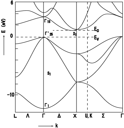 Schematics of calculated band structure of crystalline Si (NOT TO SCALE) Drawn by s-kei. Refer to this paper for the original drawing: J.R.Chelikowsky and M.L.Cohen, Phys.Rev. B10(1974)5095 DOI: 10.1103/PhysRevB.10.5095