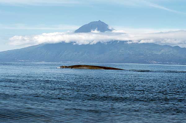 Blue Whale ( Balaenoptera musculus) with the vulcano Pico Island, Azores, in the background