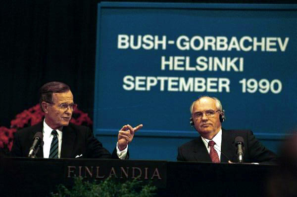 English: The US President George H. W. Bush and Soviet Predident Mikhail Gorbachev hold a press conference at the Helsinki Summit, Finland on September 9, 1990.