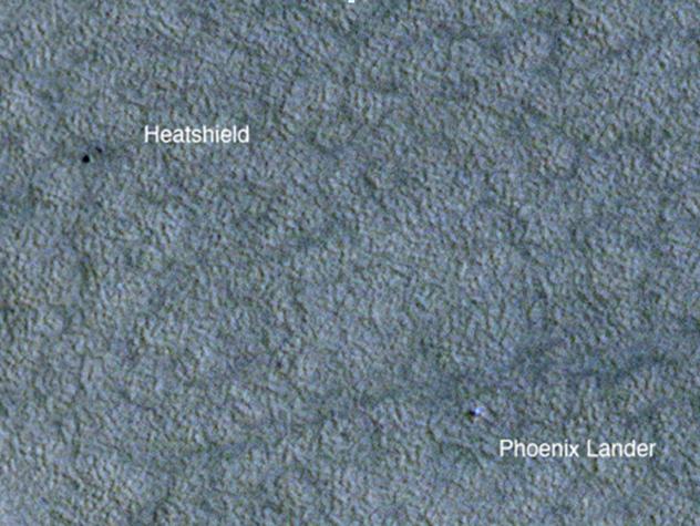 English: Phoenix Lander from HiRISE, located at 68.2 degrees north latitude and 234.3 degrees east longitude. Image was taken by the Mars Reconnaissance Orbiter's HiRISE. The HiRISE camera was built by Ball Aerospace and Technology Corporation and is operated by the University of Arizona. Image courtesy NASA/JPL/University of Arizona.
