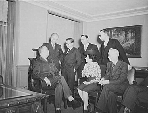 English: French journalists visit General George C. Marshall at his office in the Pentagon building. Left to right: (seated), General Marshall, Mme Etiennette Benichon, Louis Lombard, (standing) Francois Prieur, Jean-Paul Sartre, Stephane Pizella, and Pierre Denoyer