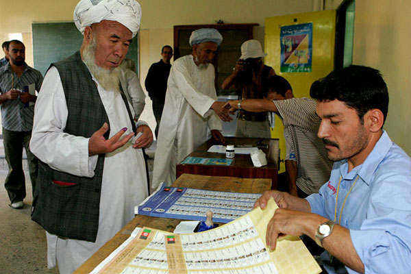 Afghan men waits to receive ballot from election worker during the successful parliamentary and provincial elections held on September 18, 2005. The elections are a major step forward in Afghanistan's development as a democratic state governed by the rule of law. |