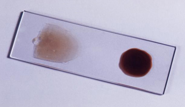 English: This prepared slide offers a good example of a thin (left) and thick (right) blood smear to be examined under the microscope. Though they are more difficult to read, thick blood films are more sensitive in detecting malaria parasites because the blood is concentrated, allowing a greater volume of blood to be examined.
