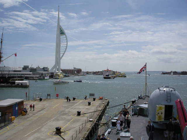 English: Busy scene at Portsmouth Harbour. Looking south from the bridge of HMS Exeter, which was visiting the Historic Dockyard. A busy scene including HMS Warrior, Wightlink ferry and FastCats, the Spinnaker Tower and the harbour entrance itself.