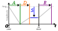 Image of how the four parameters A, D, S and R change the shape of an inverted ADSR envelope.