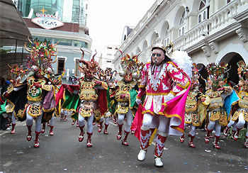 Español: En la foto, el Arcangel Miguel dirigiendo una tropa de diablos de la Fraternidad Artistica y cultural "La Diablada", en el dia del diablo y del moreno del Carnaval de Oruro "Obra maestra del patrimonio oral e intangible de la humanidad", UNESCO. La Diablada, danza primigenia de Oruro.
