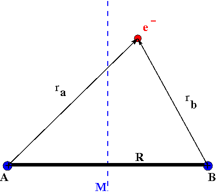 English: Geometry of Hydrogen Molecular Ion (clamped nuclei)