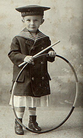 Junge mit Reifen (Spielzeug), um 1902-1905. Der 1900 geborene Georg Victor Praefcke, Sohn eines aus Mecklenburg stammenden königlich preußischen Offiziers, fotografiert in Straßburg im Elsass, trägt einen Kinder-Paletot im Stil der populären Matrosenanzüge. |