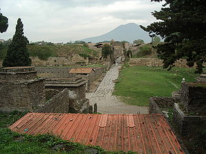 There is significant dramatic license taken in this recreation. In this scene, for example, it appears that Vesuvius is on the outskirts of Pompeii, when in reality it was 10 km (6 miles) away. A true view of Vesuvius from Pompeii can be seen at right.