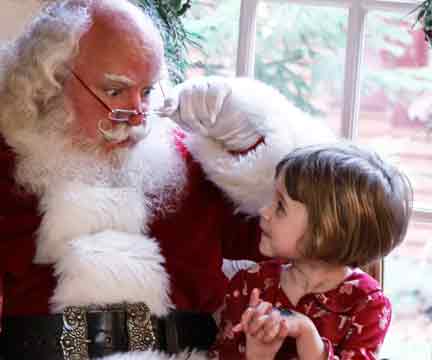 English: Santa Claus portrayed by Jonathan Meath, listening to a child's request regarding toys for Christmas.
