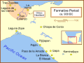 A map of the better known Mexican sites from the Formative Era, with a very general date of 600 BC (BCE). The yellow sites are known villages and towns. The smaller red dots mark locations where artifacts or art has been found without evidence of habitation.