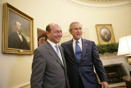 English: President George W. Bush welcomes Romanian President Traian Basescu to the Oval Office at the White House Thursday, July 27, 2006 in Washington, D.C. White House photo by Eric Draper.