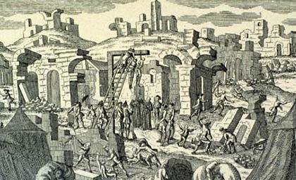 This is a close-up from The Ruins of Lisbon, a 1755 German engraving. Courtesy of the National Information Service for Earthquake Engineering (NISEE), University of California, Berkeley, with permission permitted under the terms of non-profit sharing agreement (Jan Kozak collection). Original in: Museu da Cidade, Lisbon.