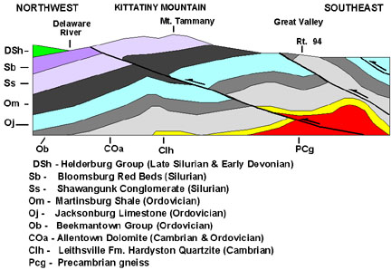 English: Generalized geologic cross-section of Kittatinny Mountain in the Delaware Water Gap National Recreation Area.