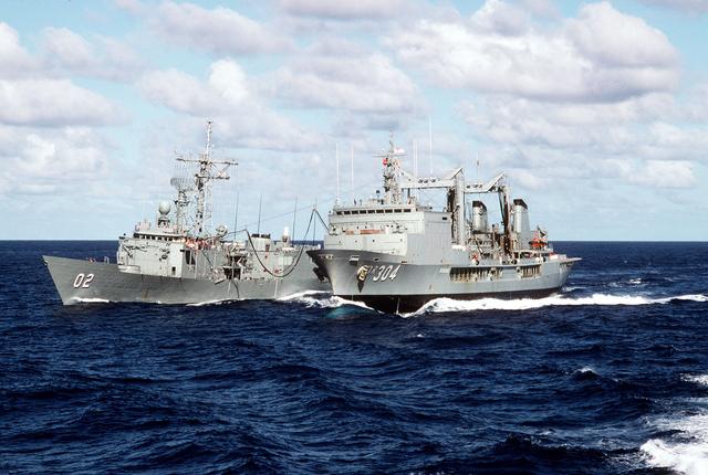 English: Sourced from: http://www.dodmedia.osd.mil/Details: ID: DNST9112040 Service Depicted: Other Service The Australian guided missile frigate HMAS CANBERRA (FFG-02) refuels from the Australian underway replenishment tanker HMAS SUCCESS (AOR-304) as the vessels takes part in exercise RimPac '88 off the coast of Hawaii. Camera Operator: PH1 TERRY COSGROVE Date Shot: 1 Jul 1988