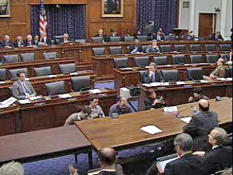 A House Financial Services Committee hearing with Federal Reserve Chairman Ben Bernanke. This is from the February 10, 2009 hearing. This image was taken by a screenshot on a computer when viewing the internet video stream of this hearing. Then the Gimp image editing program was used to crop everything except what is seen in the image. The official website for this hearing is at: http://www.house.gov/apps/list/hearing/financialsvcs_dem/hr021009.shtml The video stream is linked there.
