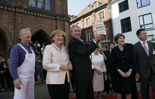 Standing with German Chancellor Angela Merkel, President George W. Bush holds up a ceremonial gift of a barrel of herring in Stralsund, Germany, Thursday, July 13, 2006. Mrs. Bush and Professor Sauer (husband of Dr. Merkel) are pictured at the right. White House photo by Eric Draper