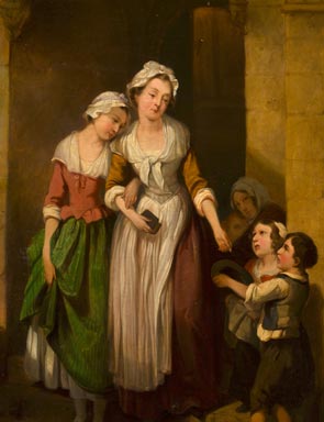 English: Giving Alms to Beggar Children, oil on canvas painting in the manner of Francis Wheatley, 36.5 x 28.75in (93 x 73cm)