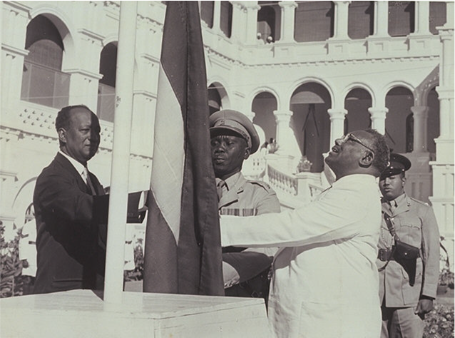 English: Sudan's flag raised at independence ceremony in the 1st of January 1956 by the Prime Minister Isma'il Alazhari and opposition leader Mohamed Ahmed Almahjoub