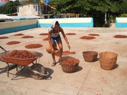 | Description | Chuao 004.JPG Mother collecting the cacao from the drying square.