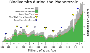 The "Big Five" mass extinctions (Raup & Sepkoski 1982) are labeled in large font, and a variety of other features are labeled in smaller font. The two extinction events occurring in the Cambrian (i.e. Dresbachian and Botomian) are very large in percentage magnitude, but are not well known because of the relative scarcity of fossil producing life at that time (i.e. they are small in absolute numbers of known taxa). The Middle Permian extinction is now argued by many to constitute a distinct extinction horizon, though the actual extinction amounts are sometimes lumped together with the End Permian extinctions in reporting. As indicated, the "Late Devonian" extinction is actually resolvable into at least three distinct events spread over a period of ~40 million years. As these data are derived at the genus level, one can anticipate that the number of species extinctions is a higher percentage than shown here.