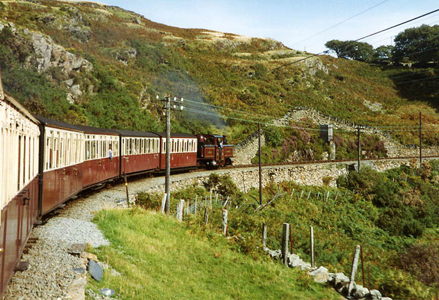 Double Fairlie Merddyn Emrys with train, approaching Campbell's Platform. |