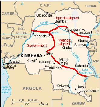 Public domain map ( http://www.lib.utexas.edu/maps/cia04/congo_demrep_sm04.gif) of the Democratic Republic of Congo modified to show territory held by armed groups supported by the government, Uganda and Rwanda in June 2003
