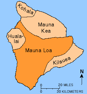 English: Map showing relationship of Mauna Loa to other volcanoes that form the Big Island of Hawaii