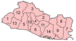 Map of the departments of El Salvador numbered in English alphabetical order.
