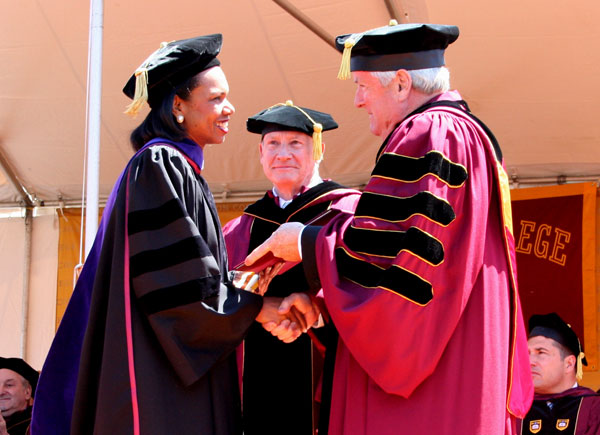Secretary Rice receives her honorary degree from Boston College President, Father William Leahy. |