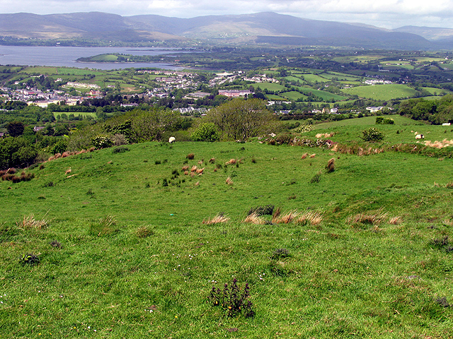 English: Pasture at the Viewpoint. This field in the foreground is at the viewpoint marked on the map. The town of Bantry is visible in the distance, in the valley. The harbour and town centre is to the far left of the built up area.