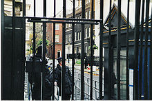 Gates were installed at both ends of the street during the premiership of Margaret Thatcher due to terrorist threats. On 7 February 1991, the Provisional IRA used a van they parked in Whitehall to launch a mortar shell at Number 10. It exploded in the back garden, while Prime Minister John Major was holding a Cabinet meeting. Major moved to Admiralty House while repairs were completed. Because of this attack, heavier security measures were imposed, if not always visible. A guardhouse stands at the gated entrance accommodating several uniformed armed police. The Metropolitan Police Service's DPG ( Diplomatic Protection Group) provides protection for ministers in London, acting on intelligence from MI5.