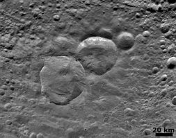 The "snowman craters" is an informal name given to a group of three adjacent craters in Vesta's northern hemisphere. Their official names from largest to smallest (west to east) are Marcia, Calpurnia and Minucia.