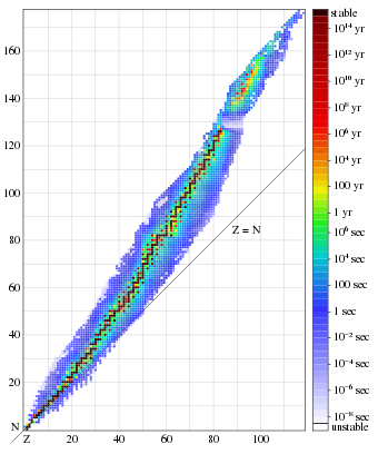 Periodic table with elements colored according to the half-life of their most stable isotope.