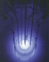 Self-illumination of a nuclear reactor by Cherenkov radiation.