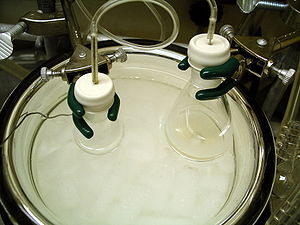 Both flasks are submerged in a dry ice/acetone cooling bath (-78 °C) the temperature of which is being monitored by a thermocouple (the wire on the left).