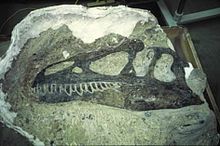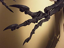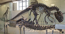 Allosaurus was a large bipedal predator. Its skull was large and equipped with dozens of large, sharp teeth. It averaged 8.5 m (28 ft) in length, though fragmentary remains suggest it could have reached over 12 m (39 ft). Relative to the large and powerful hindlimbs, its three-fingered forelimbs were small, and the body was balanced by a long, heavy tail. It is classified as an allosaurid, a type of carnosaurian theropod dinosaur. The genus has a complicated taxonomy, and includes an uncertain number of valid species, the best known of which is A. fragilis. The bulk of Allosaurus remains have come from North America's Morrison Formation, with material also known from Portugal and possibly Tanzania. It was known for over half of the 20th century as Antrodemus, but study of the copious remains from the Cleveland-Lloyd Dinosaur Quarry brought the name Allosaurus back to prominence, and established it as one of the best-known dinosaurs.