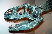 Allosaurus / ˌ æ l ɵ ˈ s ɔr ə s / is a genus of large theropod dinosaur that lived 155 to 150 million years ago during the late Jurassic period ( Kimmeridgian to early Tithonian). The name Allosaurus means "different lizard". It is derived from the Greek ἄλλος/allos ("different, other") and σαῦρος/sauros ("lizard"). The first remains that can definitely be ascribed to this genus were described in 1877 by paleontologist Othniel Charles Marsh. As one of the first well-known theropod dinosaurs, it has long attracted attention outside of paleontological circles. Indeed, it has been a top feature in several films and documentaries about prehistoric life.
