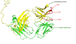 The hypervariable regions of the heavy chain is shown in red, PDB 1IGT