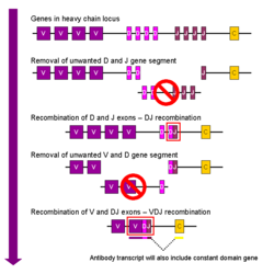 Simplistic overview of V(D)J recombination of immunoglobulin heavy chains