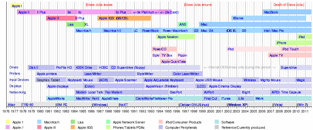 | Products | Mac ( Pro, Mini · iMac · MacBook, Air, Pro · Xserve) iPhone, iPod ( Shuffle, Nano, Classic, Touch) Apple TV, Cinema Display, AirPort, Time Capsule Mac OS X ( Server · iPhone OS), iLife, iWork |