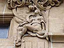 The Edward Everard building in Bristol, built during 1900–01 to house the printing works of Edward Everard, features an Art Nouveau façade. The figures depicted are of Johannes Gutenberg and William Morris, both eminent in the field of printing. A winged figure symbolises the Spirit of Light, while a figure holding a lamp and mirror symbolises light and truth.