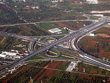 Athens' Metropolitan Area is served by the motorway network of the Attiki Odos toll-motorway (code: A6). Its main section extends from the western industrial suburb of Elefsina to Athens International Airport; while two beltways, namely the Aigaleo Beltway (A65) and the Hymettus Beltway (A64) serve parts of western and eastern Athens respectively. The span of the Attiki Odos in all its length is 65 km (40 mi), making it the largest metropolitan motorway network in all of Greece.