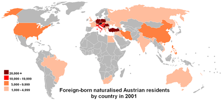According to census information published by Statistik Austria for 2001 there were a total of 710,926 foreign nationals living in Austria. Of these, the largest by far are 283,334 foreign nationals from the former Yugoslavia (of whom 135,336 speak Serbian; 105,487 Croatian; 31,591 Bosnian – i.e. 272,414 Austrian resident native speakers in total, plus 6,902 Slovenian and 4,018 Macedonian speakers).
