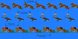 The 3D effects in the example autostereogram are created by repeating the tiger rider icons every 140 pixels on the background plane, the shark rider icons every 130 pixels on the second plane, and the tiger icons every 120 pixels on the highest plane. The closer a set of icons are packed horizontally, the higher they are lifted from the background plane. This repeat distance is referred to as the depth or z-axis value of a particular pattern in the autostereogram. The depth value is also known as Z-buffer value.