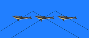 The following autostereogram shows 3 rows of repeated patterns. Each pattern is repeated at a different interval to place it on a different depth plane. The two non-repeating lines can be used to verify correct wall-eyed viewing. When the autostereogram is correctly interpreted by the brain using wall-eyed viewing, and one stares at the dolphin in the middle of the visual field, the brain should see two sets of flickering lines, as a result of binocular rivalry.