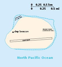 Debris from past human occupation is scattered throughout the island and in offshore waters. Most is from the U.S. military occupation of the island from 1942 to 1946. The most noticeable remnant is the 150-foot (46 m) wide, 5,400-foot (1,600 m) long airstrip. It is completely overgrown with vegetation and is unusable. In the northeast section, apparently the main camp area, are the remains of several buildings and heavy equipment. Five wooden antenna poles about 40 feet (12 m) in height remain standing in the camp. Several crashed airplanes and large equipment such as bulldozers are scattered around the island. Numerous bulldozer excavations containing the remnants of metal, fuel, and water drums are scattered about the north central portion and northern edge of the island. The Navy reported the loss of 11 landing craft in the surf during World War II.