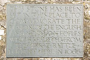 Battle Abbey was built on the site of the battle. A plaque marks the place where Harold is believed to have fallen and the location where the high altar of the church once stood. The settlement of Battle, East Sussex, grew up around the abbey and is now a small market town.