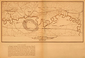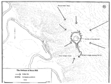Under threat of attack the first American soldiers on the battlefield three days later hurriedly buried the troopers in shallow graves, more or less where they had fallen. A couple of years after the battle, markers were placed where men were believed to have fallen, so the placement of troops has been roughly construed. The troops evidently died in several groups, including on Custer Hill, around Captain Myles Keogh, and strung out towards the Little Big Horn River.